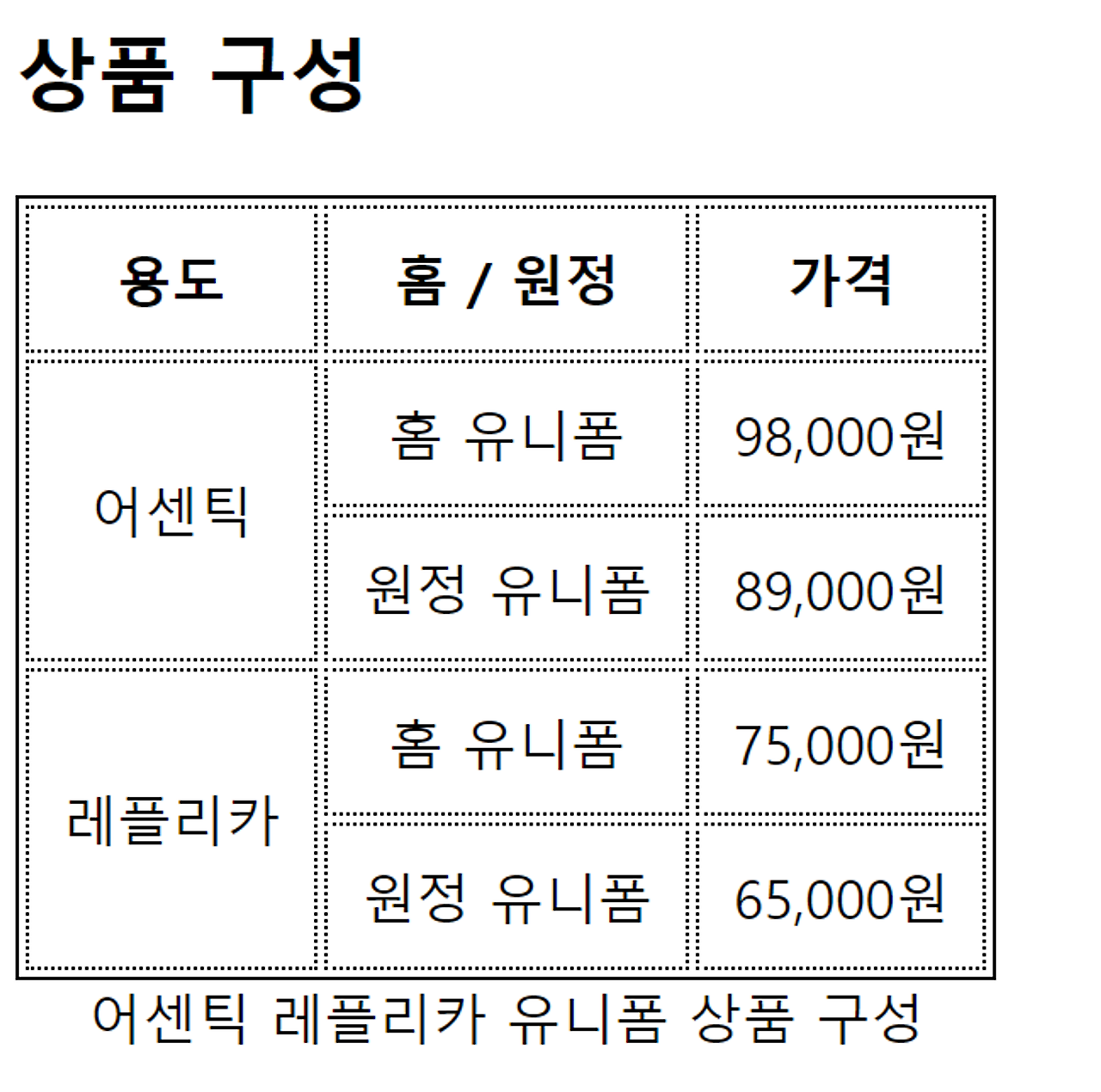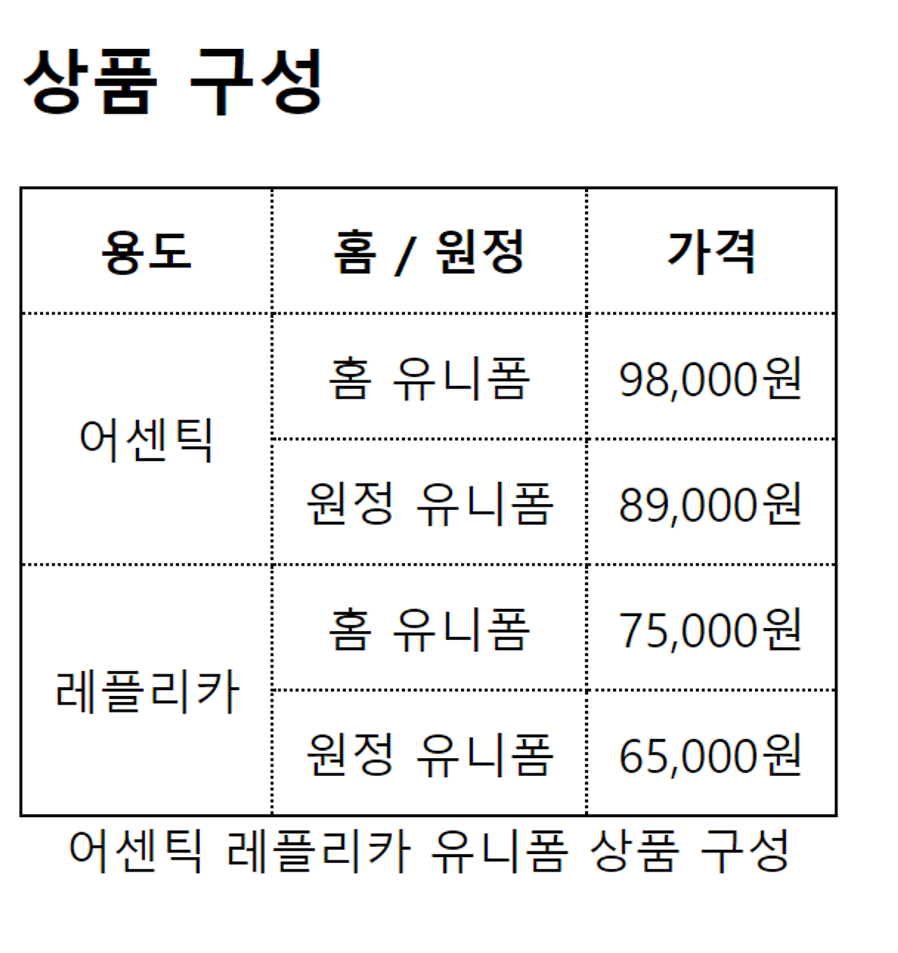 <caption>어센틱 레플리카 유니폼 상품 구성</caption>